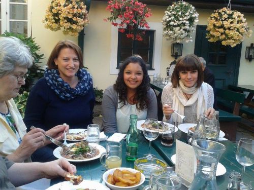 Trotz der Fußballweltmeisterschaft in Brasilien und dem wichtigen Entscheidungsspiel der Deutschen gegen die USA, das ebenfalls so wie der Beginn unseres Festes um 18 Uhr anfing, kamen alle die ihre Teilnahme zugesagt haben. Leider blieben einige Mitglieder die kommen wollten unserem Treffen fern. Sie alle versäumten einen unvergesslichen und anfangs auch sonnigen Heurigenabend! Wir saßen im schönen fast mediterranen Gastgarten, hatten einen gemütlichen und komfortablen Tisch im Bereich der unglaublich schön blühenden weißen und riesigen Hortensien, den Gerti und Willi bei der Reservierung aussuchten, und freuten uns des Lebens.