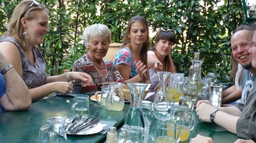 Kurz vor 18 Uhr waren schon die Ersten, vermutlich auch die Durstigsten, vor Ort. Nachdem uns der reservierte Platz nicht passte, mussten wir noch eine Weile warten bis ein anderer Tisch frei war. Der reservierte Platz war deshalb ungeeignet, weil 3 Tische separat hintereinander aufgestellt waren, die keine vernünftige Unterhaltung ermöglichten. Außerdem standen die Tische unter einem Kirschbaum, von dem die reifen Kirschen auf die Tische und Bänke nur so prasselten. Das Warten hatte sich gelohnt und wir, die große sportliche Familie, die sich jedes Jahr einmal am Ende des Schuljahres und einmal am Ende des Jahres vor Weihnachten zusammenfindet, um unsere Freundschaft und Zusammengehörigkeit zum Verein zu feiern, konnten alle um einem langen Tisch Platz nehmen.