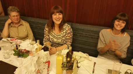 Nach diesem langen Bericht waren wir alle sehr hungrig. Die Portionen waren diesmal - vermutlich dem Anlass entsprechend - sehr groß, sodass viele von uns nicht alles aufessen konnten und die Reste mit nach Hause nahmen. Alle? Nicht alle! Melanie hat ihre Essensreste beim Zahlen an der Theke, zur großen Freude von Nina vergessen!