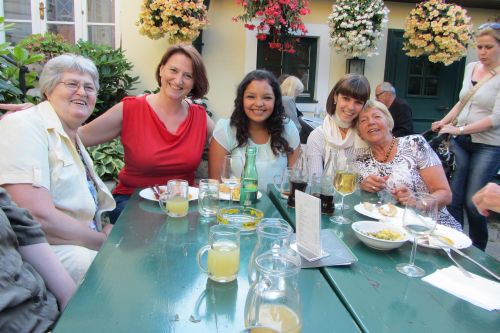 Wir freuten uns auf anregende Gespräche, für die wir im Laufe des Schuljahres keine oder nur wenig Zeit hatten und vor allem auf das gute Essen, das infolge der anwesenden Gästemenge viel zu spät serviert werden konnte! Gott sei Dank funktionierte das Getränkeservice gut, sodass wir vorab auf einen schönen Sommer ausgiebig und mehrmals prosten konnten. Wir unterhielten uns über das Leben, über die künftigen Pläne, über die Gesundheit, über die Kinder und die Kindeskinder. Auch einige fast die Grenze der Anständigkeit berührende Witze kamen auf das Tablett - Verzeihung auf den Tisch der Unterhaltung. Dabei vergaß man nicht nur die Zeit, die wieder viel zu schnell verging, sondern auch auf das Deutschlandspiel und die ganze WM! Ein schöner Abend, der leider immer kühler wurde, ging zu Ende.